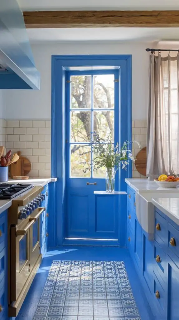 This idea works beautifully in small kitchens because the colour stays at the edges instead of taking over the space. Pair it with warm wood beams, patterned tile accents, or soft linen curtains for that Mediterranean cottage feel.