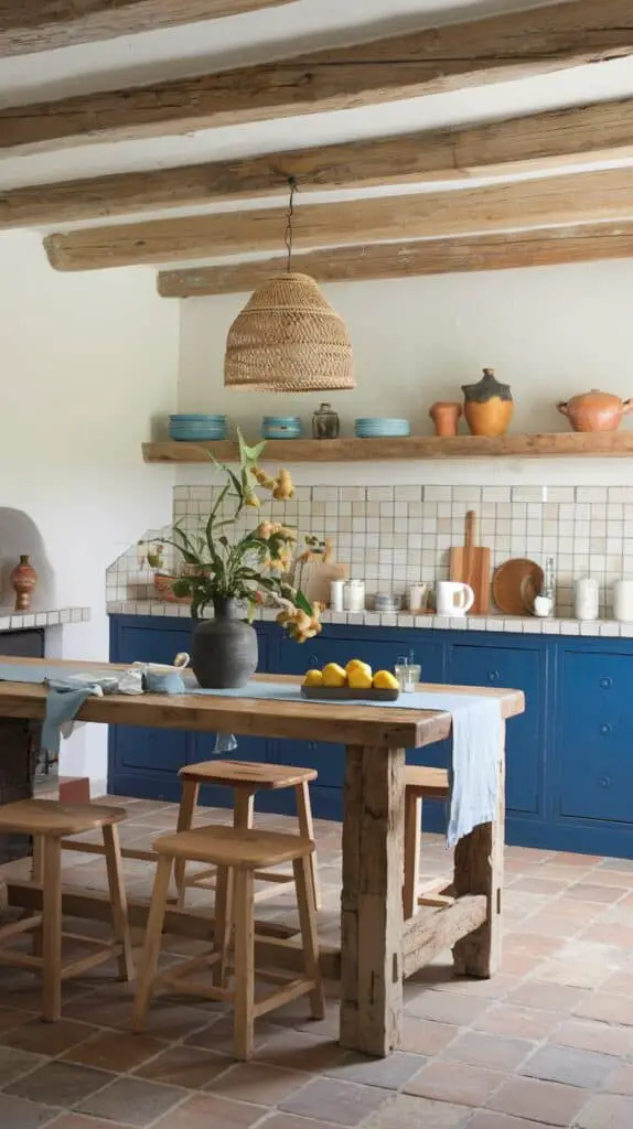 If you love a slightly rugged, earthy style, mix natural raw wood with blue elements. Think wooden beams, wooden stools, open shelves, or a rustic table paired with blue tiles or blue cabinets. This combination instantly brings in the warmth of Spanish villa kitchens — relaxed, sun-washed, and filled with texture. Add terracotta pots, lemons in a bowl, or linen table runners to soften the look.