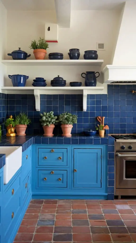 Terracotta and blue are a match made in Mediterranean heaven. Use terracotta floor tiles or pots, then layer in blue dishware, fabric, or tile. The warm and cool tones balance beautifully, creating that coastal Italian energy that makes kitchens feel inviting and homey. Even a few terracotta planters filled with herbs on a blue-painted shelf can make a small kitchen feel transformed.