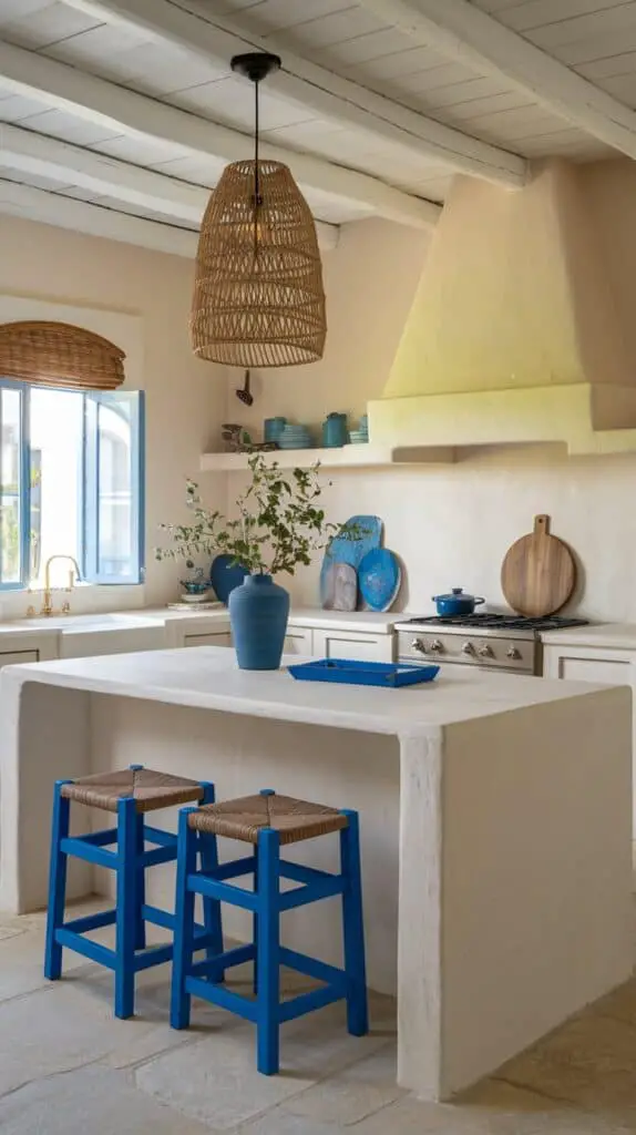 The right lighting can make your kitchen feel like golden hour all the time. Choose woven pendant lights, iron lantern fixtures, or warm brass lights. Then add blue nearby — maybe blue stools, a blue tray, or blue pottery under the lights. The glow softens the cool tones and makes the entire room feel cosy, romantic, and timeless.