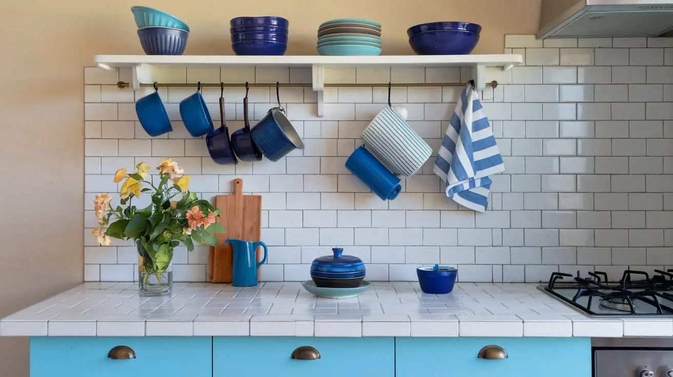 Try mixing hand-painted tiles with plain white ones to create a subtle, charming pattern. Pair the tiles with warm wood countertops, simple open shelving, and pottery in earthy tones. Even in a small kitchen remodel, a blue backsplash becomes the quiet centrepiece of the room without overwhelming the space.