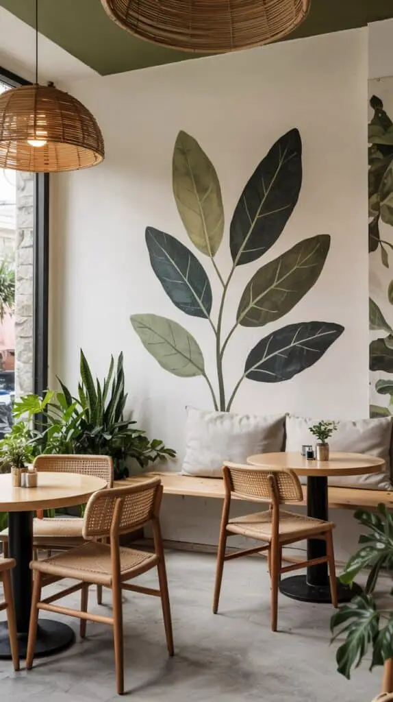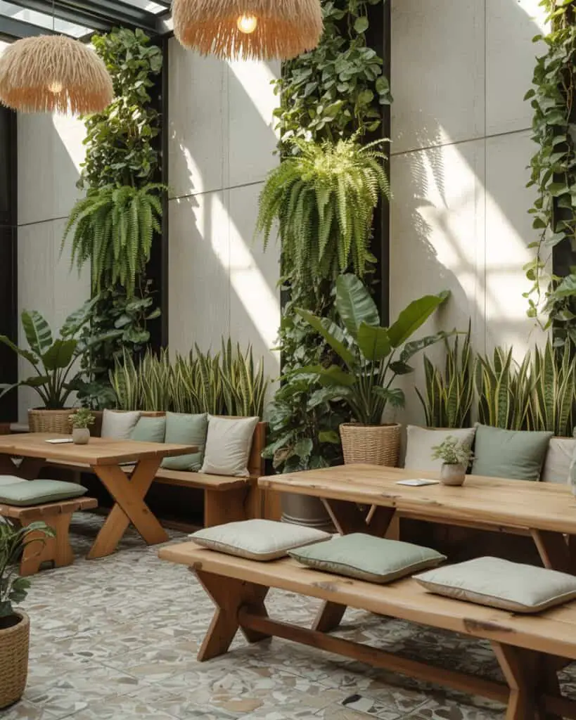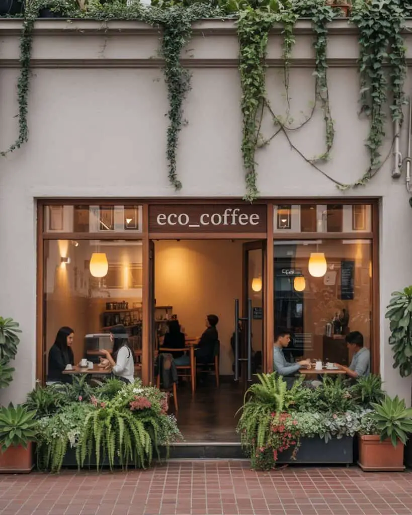 Plants are more than decoration in a sustainable coffee shop — they help define the mood of the space. When used thoughtfully, greenery softens hard surfaces and creates a sense of calm.