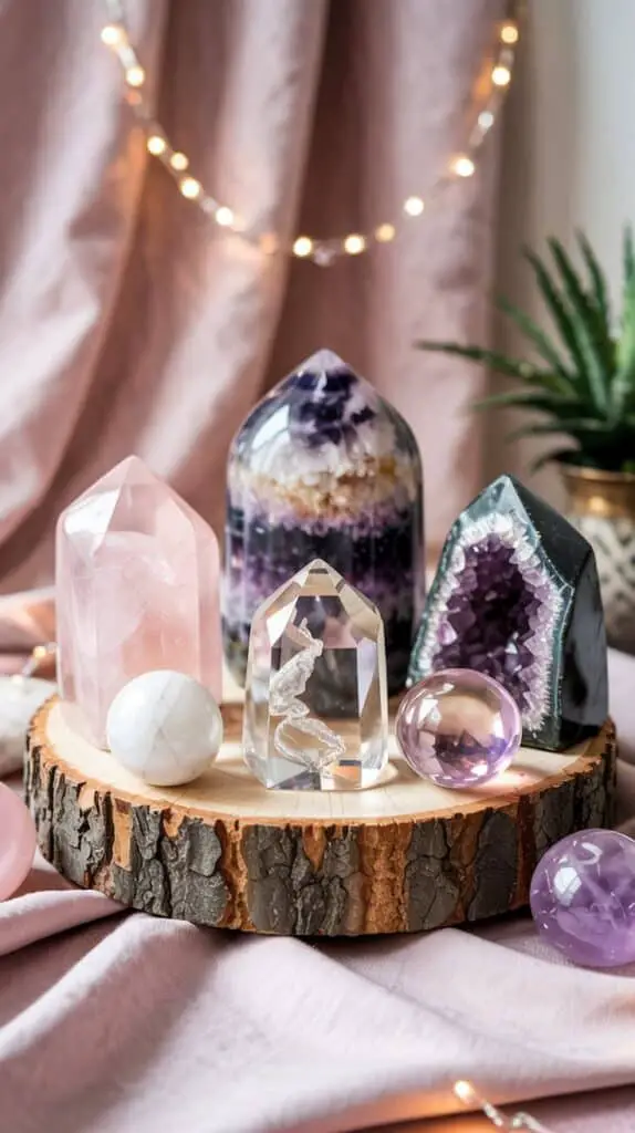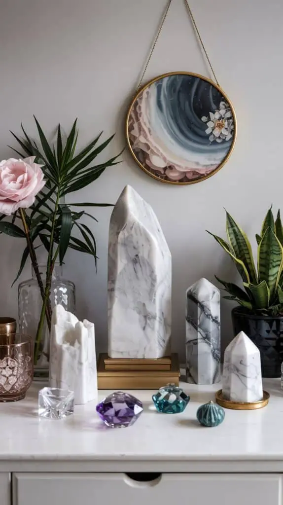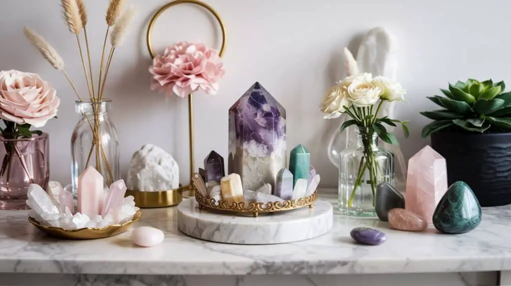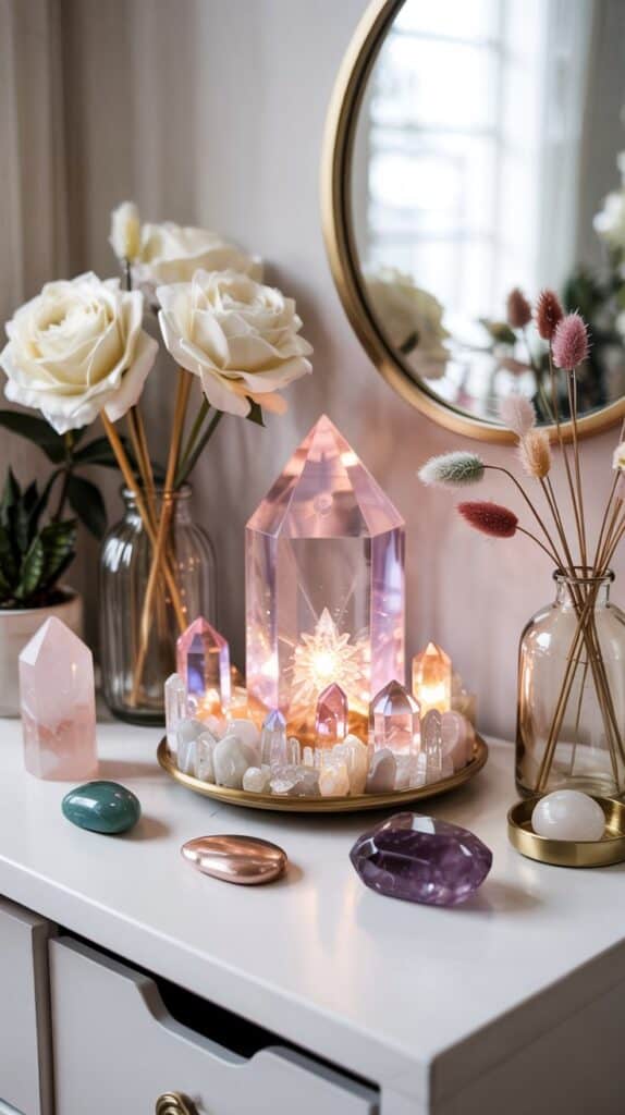 One of the secrets to stunning crystal room decor is layering pieces at different heights. High, medium, and low levels guide the eye naturally, making the entire arrangement feel curated, balanced, and slightly mystical.