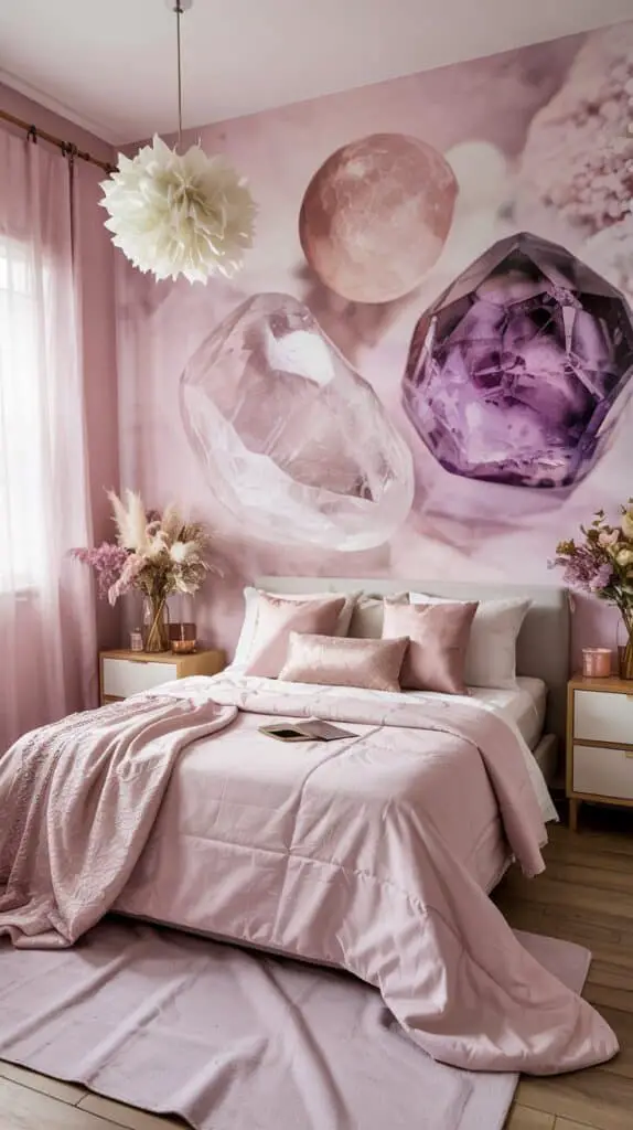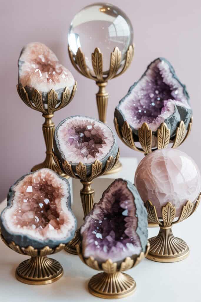 The collection you described—pink quartz geodes, amethyst clusters, crystal spheres on brass stands—reflects a timeless approach to crystal decor: part vintage, part magical, part ethereal modern.