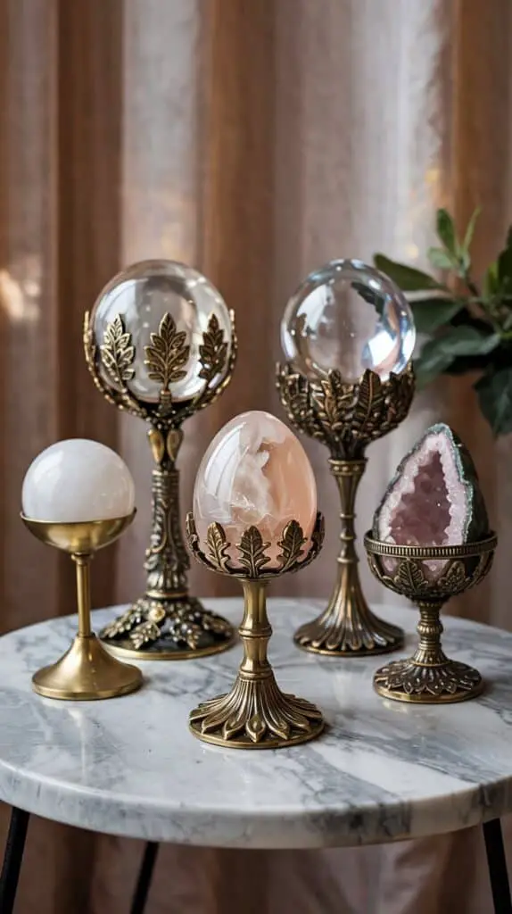 The ornate brass stands are what make this display feel luxurious and intentional. Brass warms the palette instantly, creating a vintage-meets-modern contrast that crystal lovers adore. Stands with leaf motifs, floral details, and pedestal bases highlight the natural-world themes associated with crystals and gemstone magic.