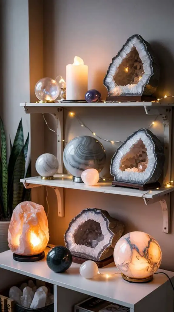 Crystals come alive under soft lighting. The gentle illumination you described helps highlight the sparkle inside the geodes and the shifting patterns within the spheres. A slightly diffused, warm-toned light works best—nothing harsh or clinical.